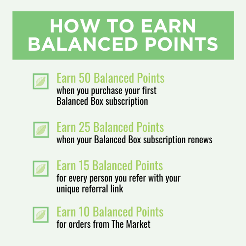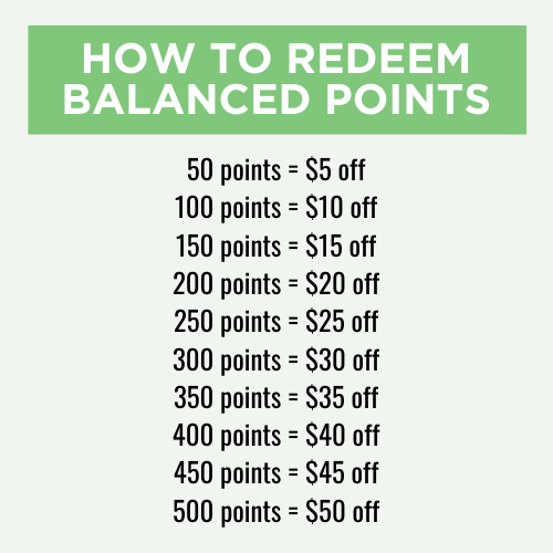 Earn & Redeem Balanced Points! The moment you complete your first purchase, you create your account and begin earning points - it's that easy!